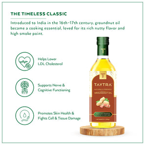 Taytra Groundnut Oil delivers a rich, nutty aroma and wholesome taste that elevates everyday cooking. Naturally cold-pressed to retain vitamins, antioxidants, and its authentic flavour, this oil provides a balanced mix of monounsaturated and polyunsaturated fats that support heart health. Its high smoke point makes it versatile for multiple cooking styles without compromising nutrients or taste.